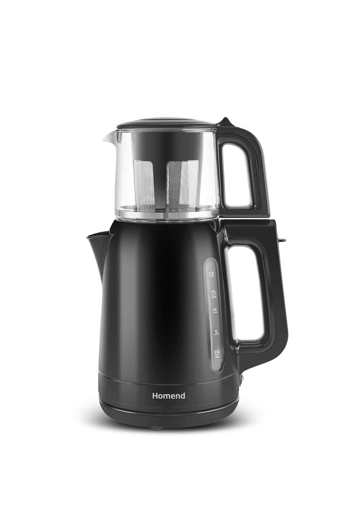 Homend Royaltea 1756H Plastik Çay Makinesi Siyah;Suyunuz Hep Sıcak, Çayınız Hep Lezzetli!;0,9 L kapasiteli cam demlik, sağlıklı bir kullanım sunarak en lezzetli çayları demlemenizi sağlar.;2,2 L kapasiteli çaycınızı, yalnızca su ısıtıcısı olarak da kullanma imkanı bulabilirsiniz.;Otomatik sıcak tutma özelliği sayesinde, istediğiniz an sıcak çayınız hazır bekler.;360 derece dönebilen güç tabanı, kullanım kolaylığı sunarak ısıtıcıyı ergonomik bir şekilde tutmanıza yardımcı olur.;Aşırı ısı koruma, susuz çalışma emniyeti ve otomatik kapanma gibi güvenlik özellikleri, her kullanımı güvenli hale getirir.;Teknik Özellikler;Çay Filtresi: Var;Demlik Kapasitesi (L): 0,9;Su Isıtıcı Kapasitesi (L): 2,2;Su Isıtıcı Max Kullanım Kapasitesi (L): 1,9;Demlik Malzemesi: Cam;Gövde Malzemesi: Plastik;Güç (W): 1800;Kaynama Göstergesi: Var;Otomatik Kapanma: Var;Susuz Çalışma Emniyeti: Var;Garanti Süresi (Ay): 24