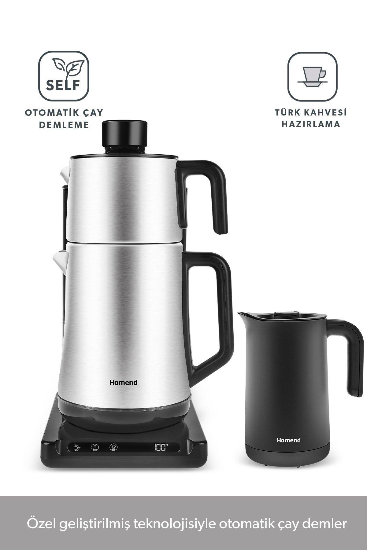 Homend Smart Royaltea Plus 1781H 2 in 1 Otomatik Çay ve Türk Kahve Makinesi Wifi Homend Smart Royaltea Plus 1781H 2 in 1 Otomatik Çay ve Türk Kahve Makinesi ile hem çay hem de Türk Kahvesi hazırlamak artık çok kolay! Özel geliştirilmiş teknolojisiyle otomatik çay demler. Taşma önleyici hassas sensörü ve 6 fincan kapasiteli potu ile otomatik Türk kahvesi hazırlar. 40°C mama suyu, 80°C bitki çayı ve 100°C su kaynatma seçenekleri ile suyunuzun sıcaklığını siz belirlersiniz. Dokunmatik panelinden tek tuşla ısı ayarlayabilirsiniz. Homend Smart uygulaması ile internet bağlantısı üzerinden uzaktan kontrol sağlayabilirsiniz. Anlık sıcaklık derecesini panel üzerinden takip edebilirsiniz. Makineniz kendi sesiyle konuşarak sizi bilgilendirir. Teknik Özellikler Çay Makinesi Watt: 2000 W ; Kahve Makinesi Watt: 500 W ; Demlik Kapasitesi: 1 LT ; Su Kapasitesi: 1,5 LT ; Çay Makinesi Demlik Malzemesi: Inox ; Çay Makinesi Gövde Malzemesi: Inox ; Çay Filtresi: Var ; Otomatik Kapanma: Var ; Kaynama Göstergesi: Var ;